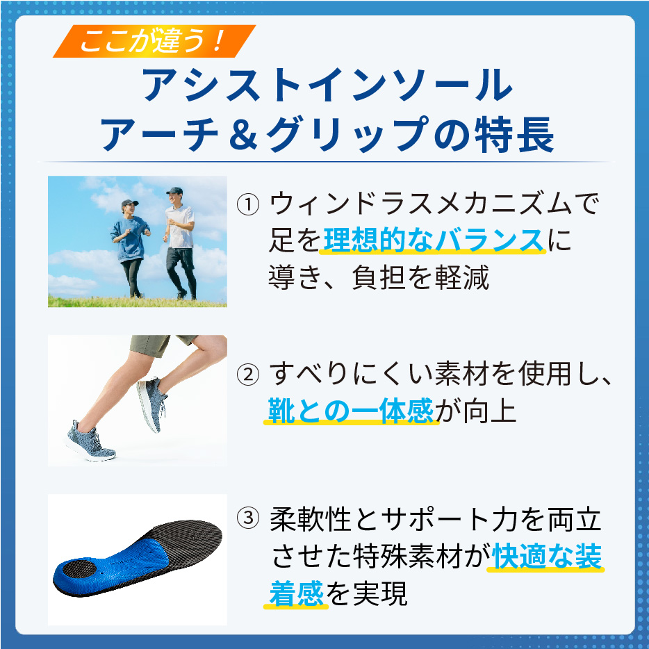 日本シグマックスの技術が詰まったインソールで、疲れにくく安定した歩行をサポートします。