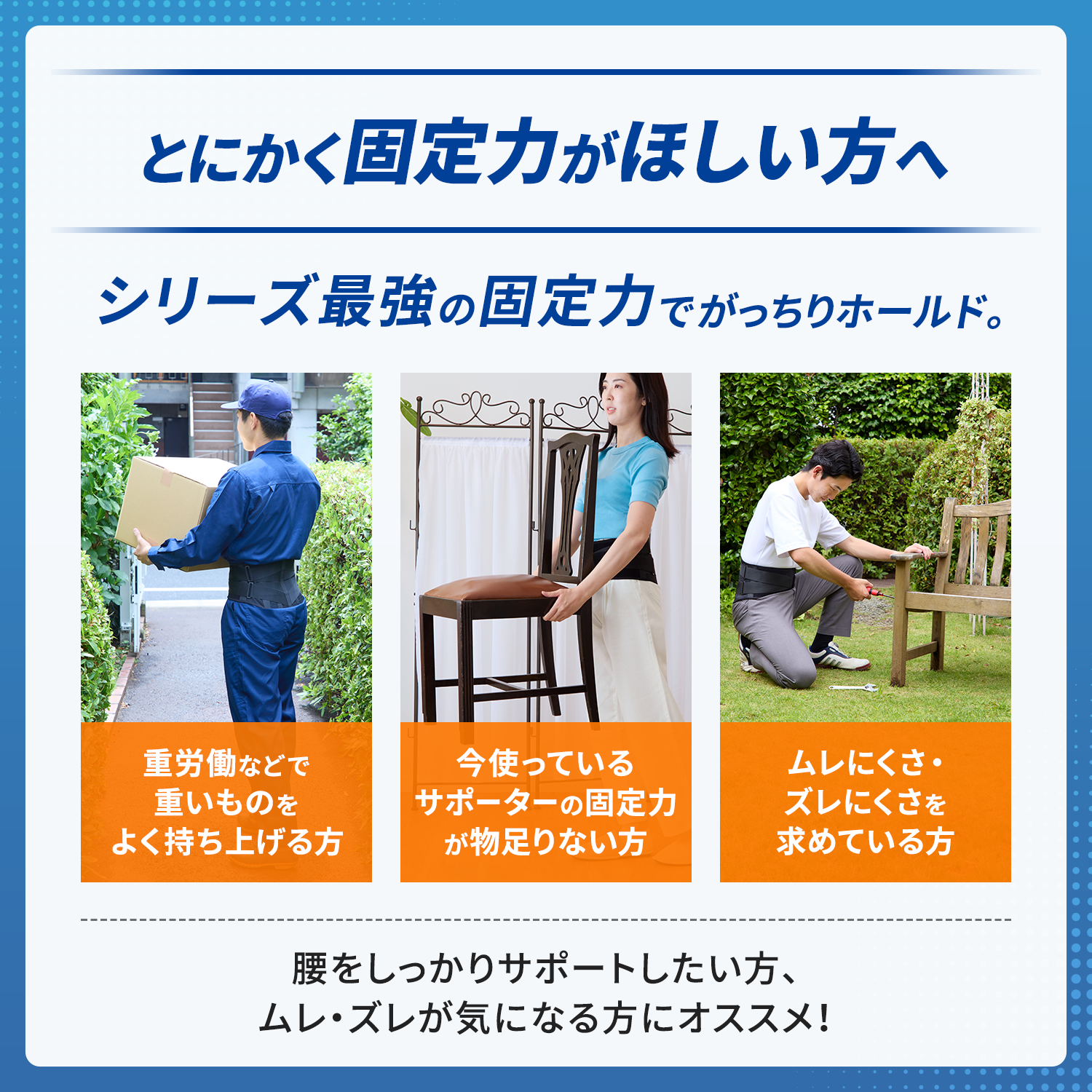・中腰・荷物持ち上げ・連続作業など、腰に負担のかかる場面で使用してください。